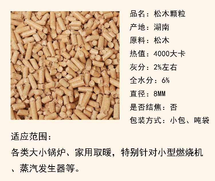 松木颗粒是由松木原材料经过破碎、粉碎、压制成直径8MM的圆形颗粒状生物燃料,此产品质量优异,不结焦,热值高,且无烟,特别适合小型生物质燃烧机及蒸汽发生器等燃烧器。